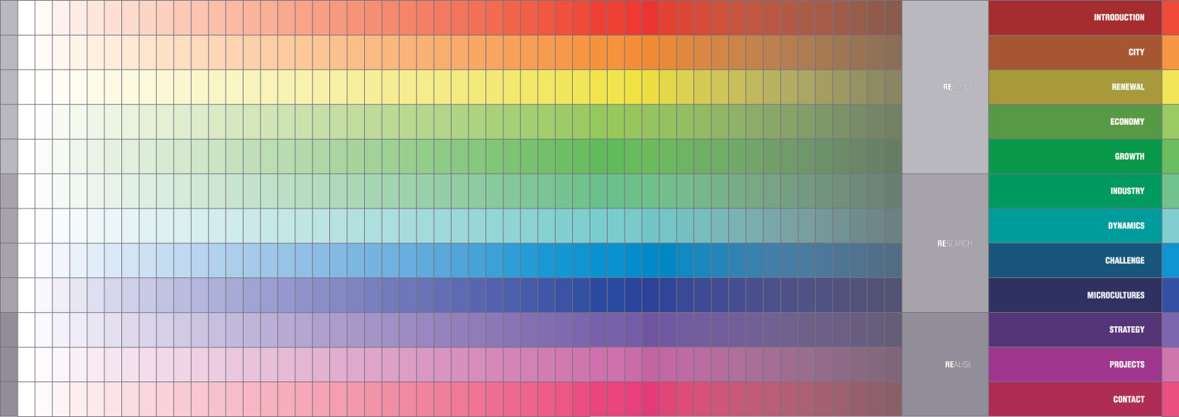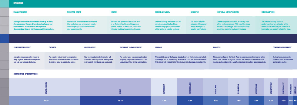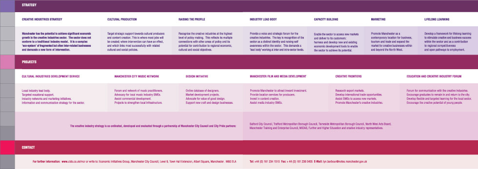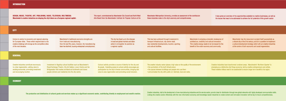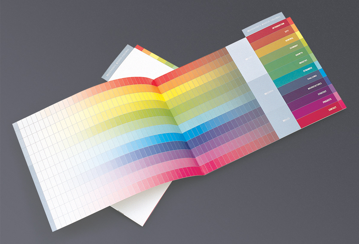 Colour aids navigation and illustrates the fact that the document examines the full spectrum of Manchester's creative industries. The white cover, representative of a full spectrum blend, has a protruding silver tab to enable it to be quickly referenced when filed.