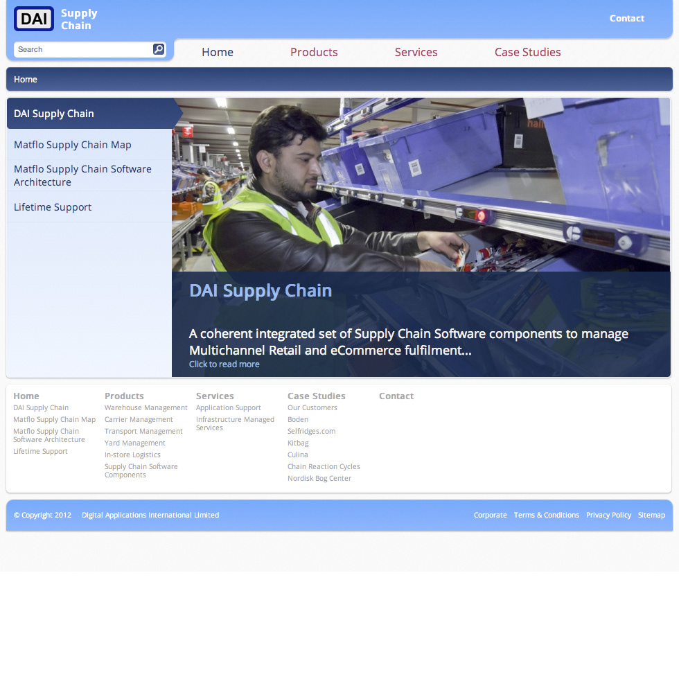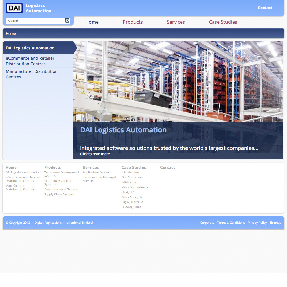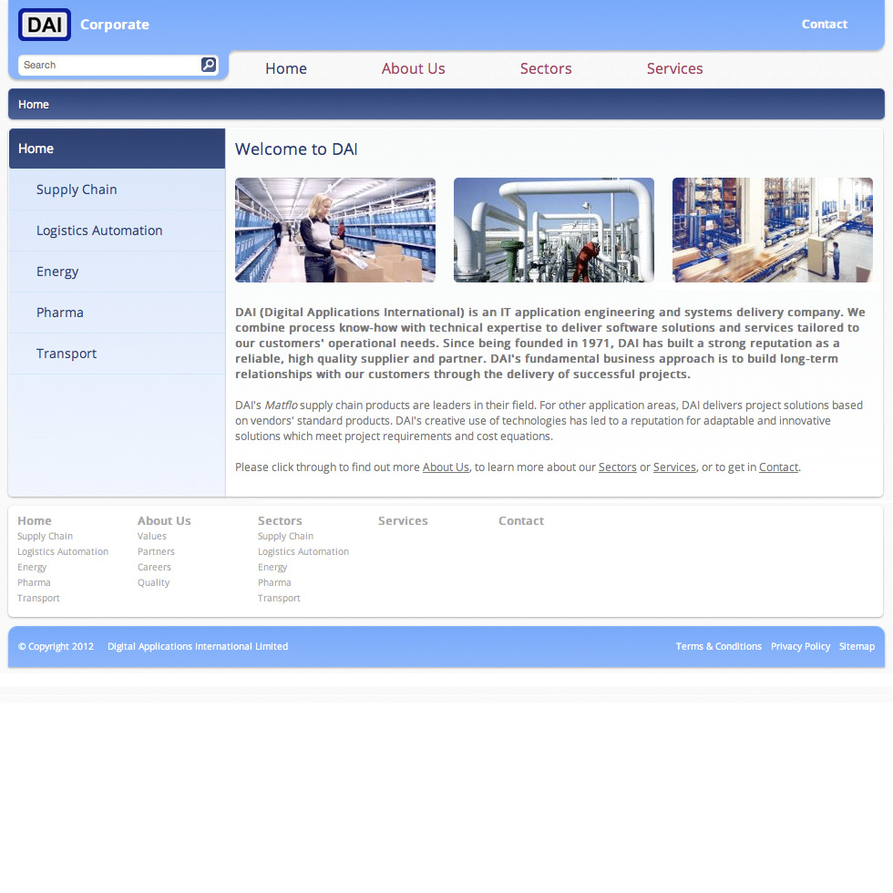Digital Applications International (DAI) required an online strategy to promote their corporate profile and business units, together or independently. The solution comprises a corporate website linked to five separate business unit websites. The design style was prescribed by the client, to be the same as DAI’s applications, to provide familiarity for existing users and introduce the brand to new prospects. A bespoke content management system (CMS) enables senior management to add or remove content across all sites and add editors to business unit sites. Editors have a choice of templates to use for different combinations of imagery and text. The corporate site provides an overview of the company, sectors worked for and services provided. The business unit sites promote products and services, supported with case studies. Users can navigate to any business unit site via the corporate site’s sub navigation, and return via a corporate link in the footer, or by clicking the DAI logo. Site maps, created dynamically by the CMS, can be toggled on or off. A breadcrumb trail appears across a bar below the main navigation. Slide decks cycle through imagery and text teasing users to discover more. A contact form, which self validates, enables expressions of interest. Office locations, shown using Google Map technology, help users find their way with ease. A search bar helps find site-specific information.