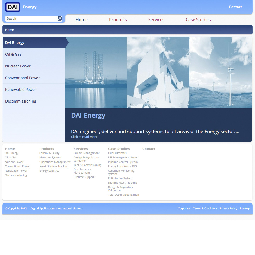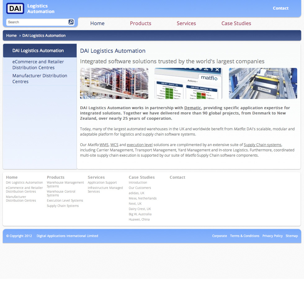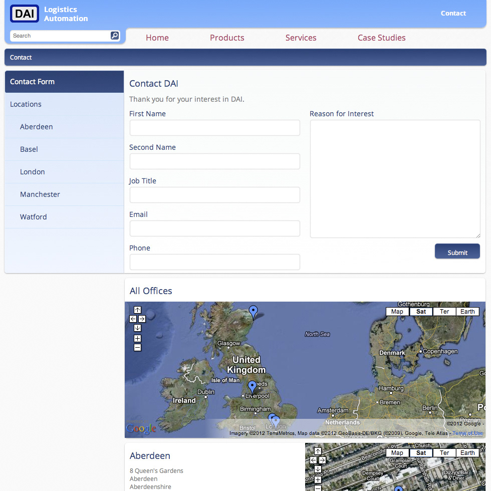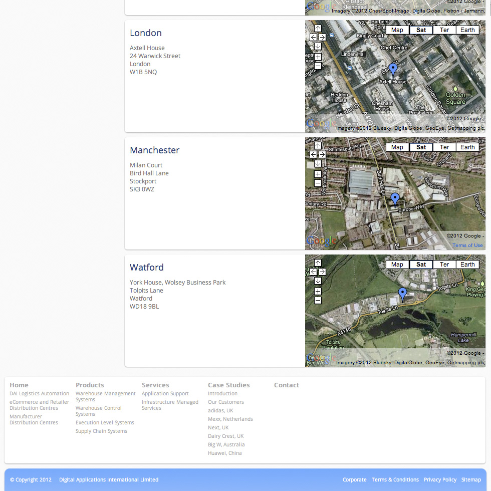 Digital Applications International (DAI) required an online strategy to promote their corporate profile and business units, together or independently. The solution comprises a corporate website linked to five separate business unit websites. The design style was prescribed by the client, to be the same as DAI’s applications, to provide familiarity for existing users and introduce the brand to new prospects. A bespoke content management system (CMS) enables senior management to add or remove content across all sites and add editors to business unit sites. Editors have a choice of templates to use for different combinations of imagery and text. The corporate site provides an overview of the company, sectors worked for and services provided. The business unit sites promote products and services, supported with case studies. Users can navigate to any business unit site via the corporate site’s sub navigation, and return via a corporate link in the footer, or by clicking the DAI logo. Site maps, created dynamically by the CMS, can be toggled on or off. A breadcrumb trail appears across a bar below the main navigation. Slide decks cycle through imagery and text teasing users to discover more. A contact form, which self validates, enables expressions of interest. Office locations, shown using Google Map technology, help users find their way with ease. A search bar helps find site-specific information.