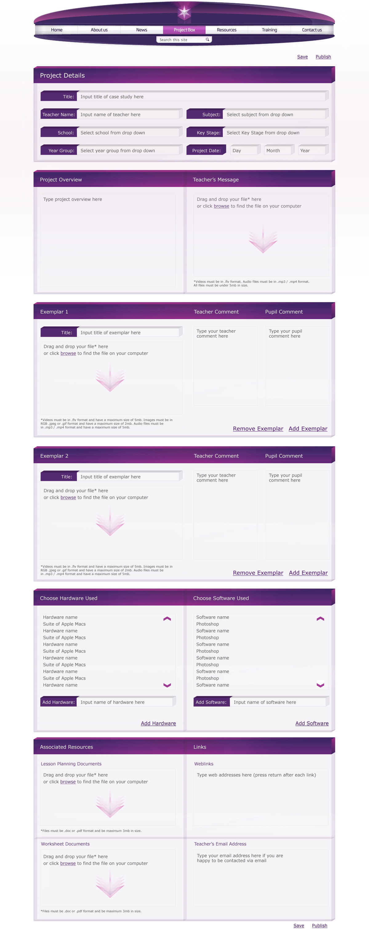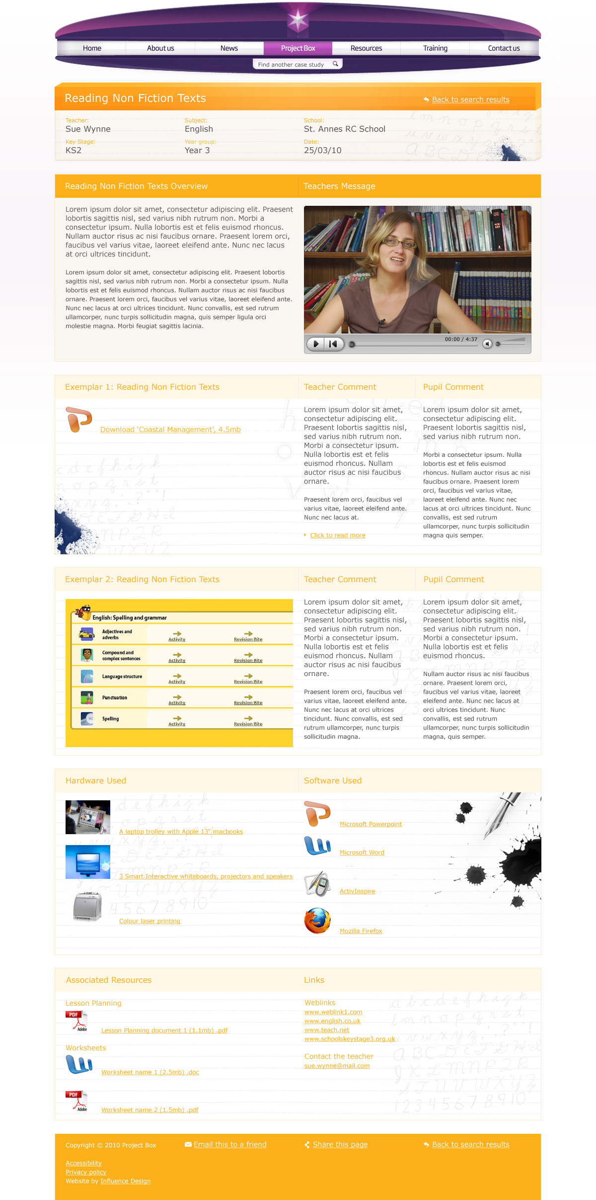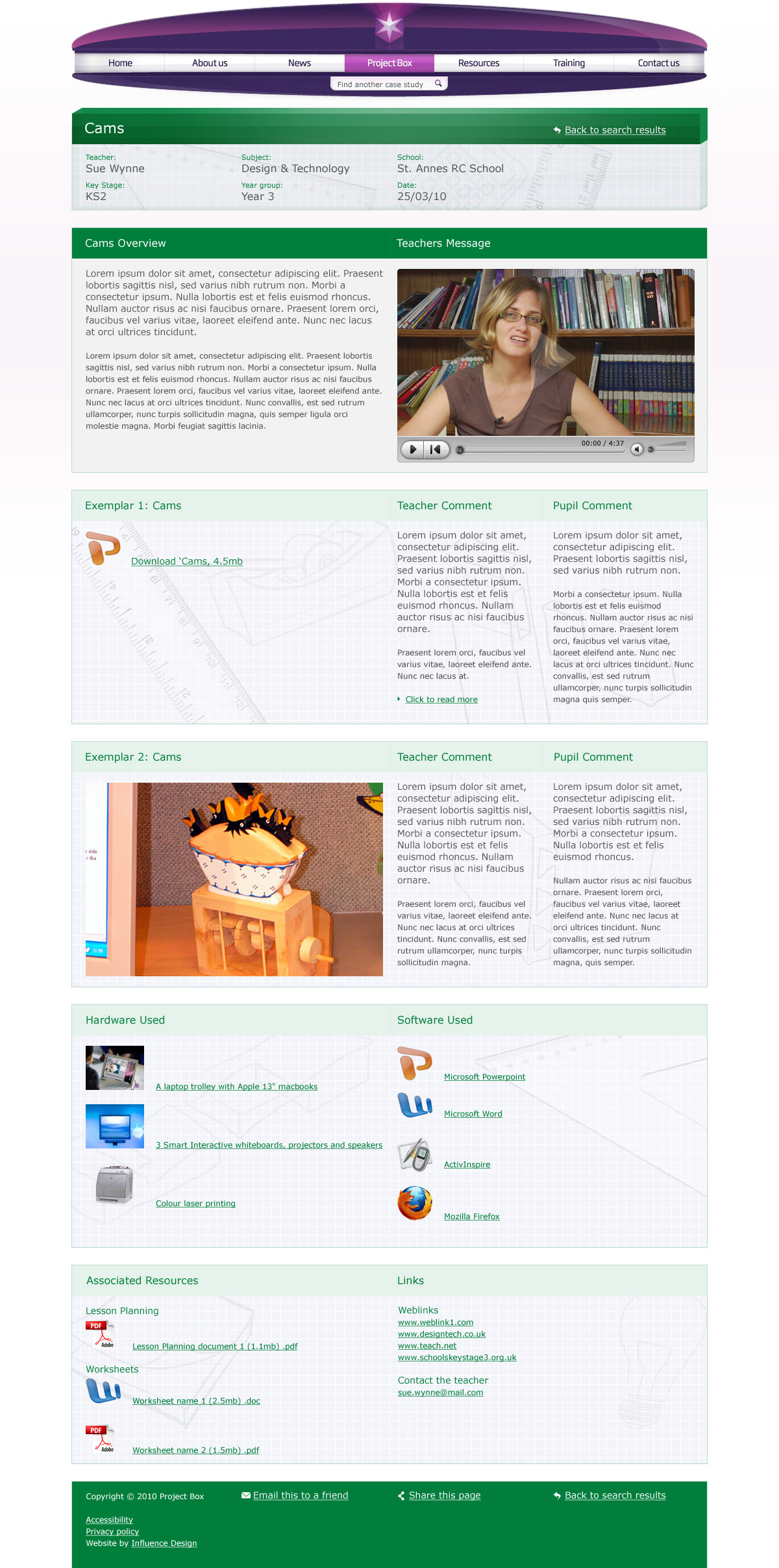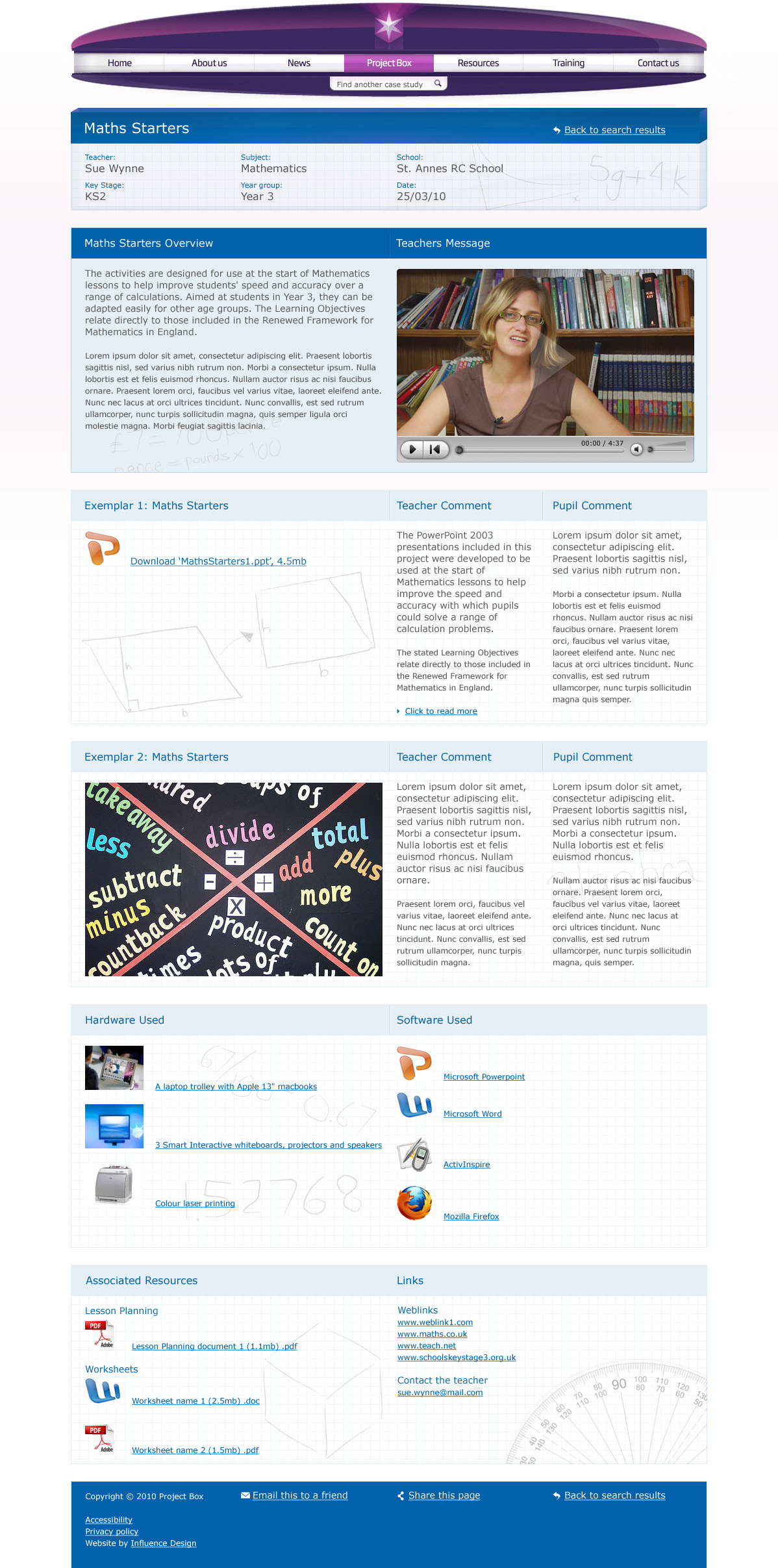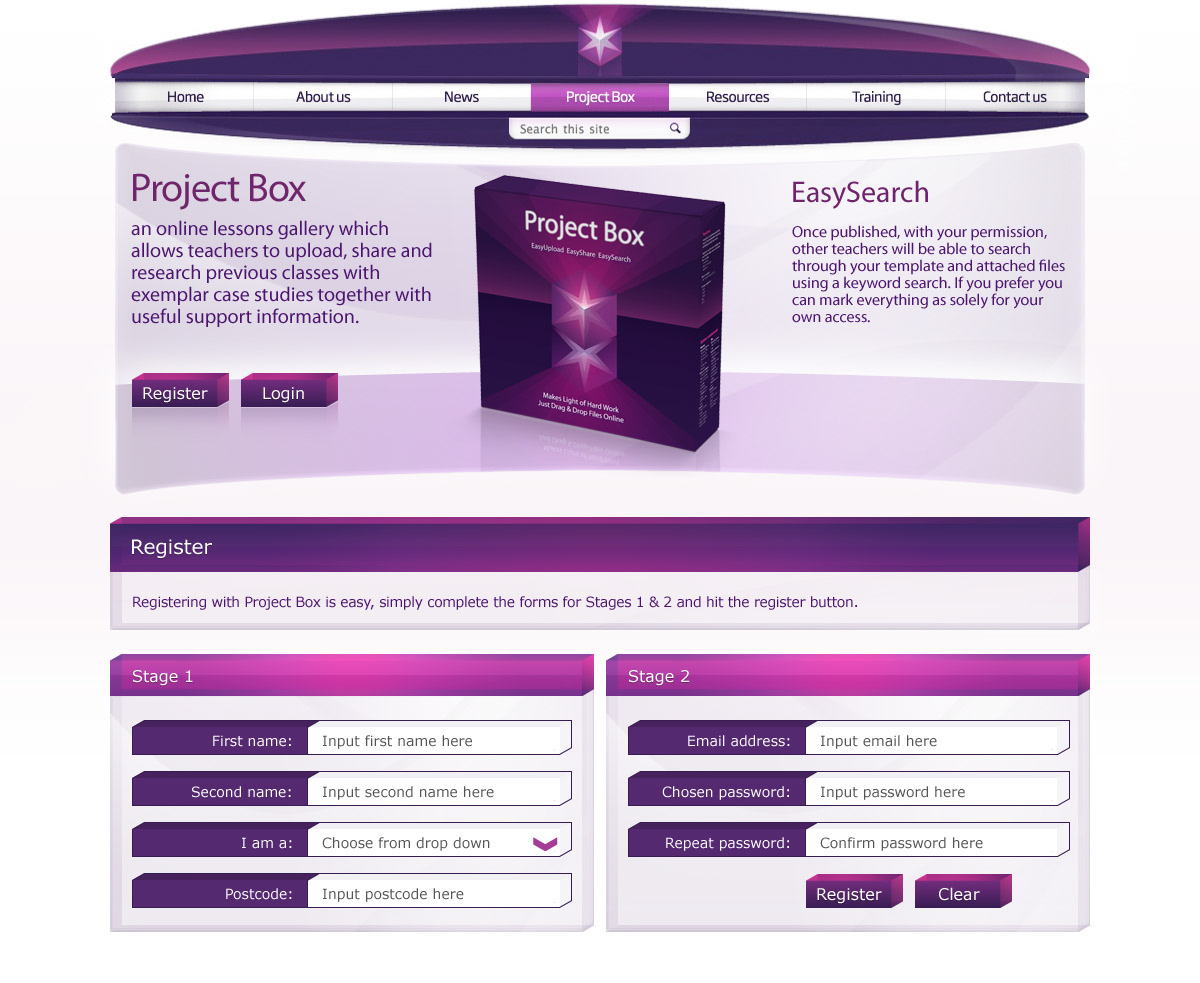 Project Box is a website that allows teachers to upload, view and share exemplar case studies via the web. Teachers can view other exemplars for inspiration or upload their own case studies for others to see. Accepted media ranges from MS Word documents to Flash Video and Podcast. The interface enables users to drag and drop media quickly and easily into the relevant sections. Colour coding identifies subject areas with supporting related background imagery.